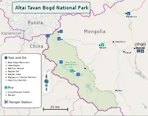 - «Altai Tavan Bogd National Park» (en mongol). Bayan-Ulgii Province. Archivado desde el original el 20 de junio de 2020. Consultado el 31 de mayo de 2020.