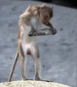 ![]() Macaca fascicularis aurea en la isla de Piak Nam Yai, usando una herramienta de piedra. | ||