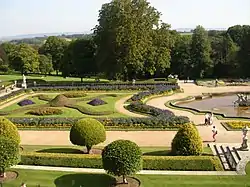 En el Palacio de Kensington, entonces un suburbio de Londres, las plantaciones de los parterres fueron debidas a Henry Wise, cuyo vivero se encontraba cerca de Brompton. En el grabado de 1707/08 (ilustración de la derecha), los diseños Barrocos puestos al día de cada sección son diseños acortados del movimiento en sentido vertical, simétricamente alrededor de un centro, con setos bajos resaltados por árboles cónicos en las esquinas. Sin embargo, su trazado original del siglo XVII, con un paseo amplio dividido en central de grava, dividido a su vez en pares, y cada uno subdividido en cuatro, parece haber sobrevivido de la anterior Nottingham House (antes de 1689), antes de haberse transformado en palacio. Las alas subsidiarias tienen parterres subsidiarios, sin ninguna intención de integración al resto del conjunto.