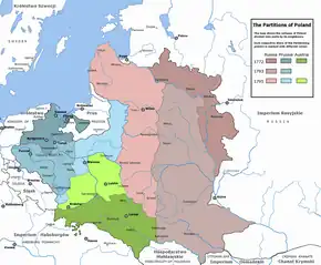 ![]() Las tres particiones de la Mancomunidad Polaco-Lituana. La Partición rusa (rojo), la partición austriaca (verde) y la partición prusiana (azul) | ||
