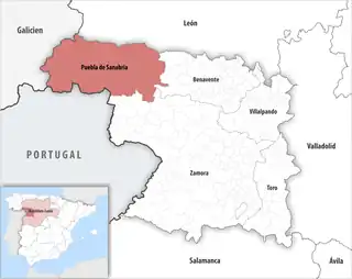 Asturianos, Cernadilla, Cobreros, Espadañedo, Galende, Hermisende, Justel, Lubián, Manzanal de Arriba, Manzanal de los Infantes, Molezuelas de la Carballeda, Mombuey, Muelas de los Caballeros, Palacios de Sanabria, Pedralba de la Pradería, Peque, Pías, Porto de Sanabria, Puebla de Sanabria, Requejo, Rionegro del Puente, Robleda-Cervantes, Rosinos de la Requejada, San Justo, Trefacio y Villardeciervos.