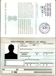 ![]() La portada de un pasaporte indio actual (2021). | ||