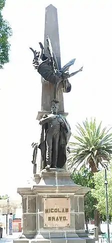 En 1896, se alzó un monumento en memoria de Nicolás Bravo, quien desempeñó tres veces el cargo de presidente de México. La escultura fue inaugurada en 1898 por el presidente Porfirio Díaz, quien al mismo tiempo "puso la primera piedra para el monumento dedicado a la Independencia, frente a la iglesia de Guadalupe, de donde se había quitado el busto de Miguel Bravo."[2]