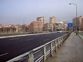 Pasado el río Manzanares deja el distrito de Arganzuela para entrar en el antiguo municipio de Carabanchel Bajo, hoy distritos de Carabanchel y Usera.