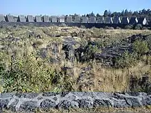 La plataforma está construida con base en dos muros de piedra volcánica, que contiene relleno de balastra, para obtener un piedraplén permeable. La altura de los muros varía debido a la topografía del terreno (oscila entre los 50 centímetros y los 9 metros). La superficie está acabada en grano de tezontle, para mantener la permeabilidad y proporcionar un toque de color.[5] Sobre la plataforma se erigen 64 prismas poliédricos de base rectangular , de 9*3 metros, con una altura de 4 metros. La disposición de estos módulos es por cuadrantes, en cada uno hay 16 módulos separados entre sí por una distancia de 1.75 metros en el perímetro interior, y sobre el exterior de 2.67 metros. Los cuadrantes de los cuatro puntos cardinales miden 3.60 metros sobre el perímetro interior y 4.80 metros sobre el exterior, de tal forma que donde están marcados los puntos cardinales hay una separación mayor, claramente visible.