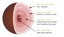 En la superficie, la presión es lo suficientemente baja como para que los núcleos convencionales, como el helio y el hierro, puedan existir independientemente unos de otros y no se aplasten entre sí debido a la repulsión mutua de Coulomb de sus núcleos.[5] En el núcleo, la presión es tan grande que esta repulsión de Coulomb no puede soportar núcleos individuales, y debería existir alguna forma de materia ultradensa, como el teorizado plasma de quarks-gluones.