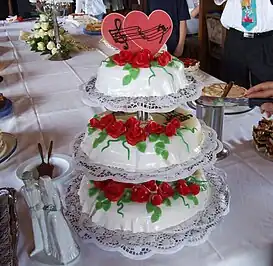 El pastel de bodas, tarta nupcial, torta de novios o torta de casamiento es el postre tradicional que se sirve a los invitados de una boda después de la ceremonia. En la cultura occidental moderna, suele tratarse de una gran tarta de varios pisos o capas, decorada con abundante glaseado (a menudo sobre una capa de mazapán o de dulce de caramelo), y coronada por una pequeña figura que representa la pareja. Otros motivos muy utilizados son las palomas blancas, las alianzas doradas y las herraduras (estas últimas simbolizan la buena suerte). Conseguir elaborar una tarta densa y consistente, que aguante bien las decoraciones y a la vez sea comestible, podría considerarse la mayor demostración del arte y la destreza del pastelero.