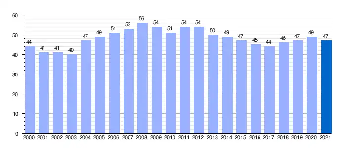 | Gráfica de evolución demográfica de Peñas del Erizo[11] entre 2000 y 2021 |