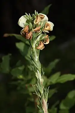 Se trata de una planta perenne herbácea que produce uno o más tallos de hasta 40 centímetros de altura desde un caudex. Las hojas miden hasta 18 centímetros de largo, en forma de lanza a oblonga, y dividida en muchos lóbulos lineales que pueden ser dentados o de bordes lisos. La inflorescencia es un racimo de flores que ocupa la parte superior del vástago. Cada flor es de un centímetro o un poco más de largo, de color blanco a amarillento, y se divide en un labio superior en espiral o curvado en forma de pico y de tres lóbulos del labio inferior.[2] El fruto es una cápsula de hasta un centímetro que contiene muchas semillas reticuladas.[3]