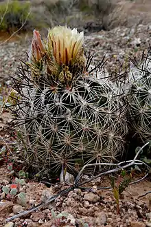 Es una planta de color gris a azul-verdoso, por lo general solitaria, a veces en grupos que forman cuerpo de la planta siendo esférica a oval y cilíndrica con la edad. Alcanza un tamaño de 5 a 20 cm (raramente 30 cm) de altura y un diámetro de 5 a 12 cm. Las costillas son cónicas, redondas u ovaladas, las areolas lanosas, de color crema a gris con 4 al 8 espinas centrales de 1,5 a 3 cm de largo. Las 10 a 16, espinas radiales están irregularmente dispuestas en forma de agujas y son de color blanco a gris con 1 a 2 cm de largo. Las flores en forma de embudo aparecen alrededor de la corona y tienen una longitud y un diámetro de hasta 2,5 cm. La mayoría son de color amarillo a marrón, rara vez de color rosa. El período de floración es de abril a mayo. El fruto es cilíndrico a oval de 1,2 cm de largo y tiene un diámetro de 8 mm. Contienen de 3 a 15 semillas de color gris, marrón a casi negro que maduran en 4 a 6 semanas.