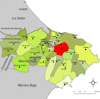 Municipio incluido en la comarca de la Marina Alta, en los contrafuertes del sistema prebético externo valenciano; el término se abre al valle del río Girona y aparece accidentado en su mitad meridional por promontorios recortados como la colina de las Hoyas, la Montaña Grande, la Peña del Perro Flaco, el Castillo de la Solana o Castillo de Aixa. Drenan sus tierras los barrancos de La Alberca y sus afluentes, el de Marx y Las Fuentes.