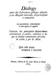 - Diálogo entre dos labradores gallegos afligidos y un abogado instruido, despreocupado y compasivo. Cuaderno primero al cual seguirá el segundo. Contiene las principales disposiciones eclesiásticas y civiles, relativas á los que se llaman comunmente derechos de estola y pie de altar
