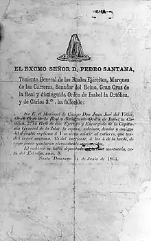 (...) mandé dar sepultura eclesiástica al cadáver del Excmo. Sor. Teniente General Don Pedro Santana, Marqués de las Carreras, de sesenta y tres años de edad, natural de Hincha, esposo en segundas nupcias de Doña Ana de Zorrilla, e hijo legítimo de Don Pedro y Doña Petrona Familias: Falleció ayer de inflamación cerebral; habiendo recibido el Sacramento de la extremaunción; hizo testamento ante el Notario Don José Ma. Pérez. (...)». - «FALLECIMIENTO DEL GENERAL DOMINICANO EXCMO. SEÑOR DON PEDRO SANTANA, MARQUÉS DE LAS CARRERAS». El Mundo Militar. Panorama Universal. 7 de agosto de 1864.