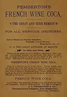 En una entrevista de 1885 con el Atlanta Journal, Pemberton afirmó que la bebida beneficiaría a "científicos, eruditos, poetas, teólogos, abogados, médicos y otros dedicados al esfuerzo mental extremo".[6][7] El 25 de noviembre de 1885 el condado de Fulton, cuya sede era Atlanta, votó para aprobar la ley seca, a iniciarse el 1 de julio de 1886. Pemberton vio la noticia en la calle y empezó a desarrollar una fórmula de su vino francés de coca pero sin alcohol, resultando en la fórmula de la bebida Coca-Cola.[8][9]