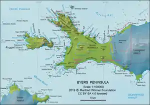 La península de Byers es una península principalmente libre de hielo que forma el extremo oeste de la isla Livingston en las islas Shetland del Sur de la Antártida. Ocupa 60 km²,[1] e incluye el pequeño lago Basalt de agua dulce. La península Byers tiene un régimen de protección ambiental especial bajo el Sistema del Tratado Antártico y requiere un permiso para ingresar.[2]