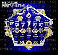 - Pentatlón (Velocidad, Salto de longitud, Tiro con rifle de aire cal .177 (4.5 mm), natación, Carrera a campo traviesa (campo a través)