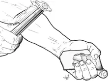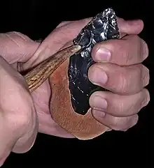 - Extracción de hojas con un sistema de fijación del núcleo a la mano y la ayuda de un bastón-compresor apoyado en la axila: método ya experimentado por Crabtree, permite aumentar la fuerza con que se presiona el núcleo obteniendo, así, hojas ligeramente más grandes y minimizando los accidentes de talla.