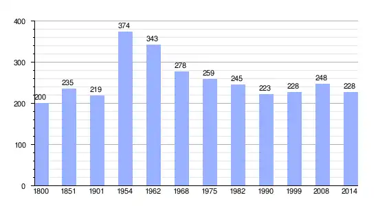 Los datos demográficos contemplados en este gráfico de la comuna de Percy-en-Auge[4] se han cogido de 1800 a 1999 de la página francesa EHESS/Cassini, y los demás datos de la página del INSEE.[5]