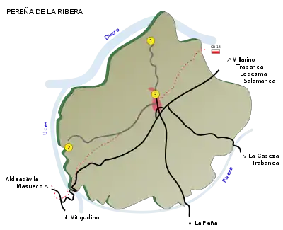 | Noroeste: Peredo da Bemposta (Portugal) | Norte: Peredo da Bemposta (Portugal) | Noreste: Villarino de los Aires |