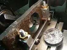 Agujero trepanado en placa de acero, con el tapón retirado y la herramienta que lo cortó; en este caso el portaherramientas está montada en un cabezal de torno mientras que la pieza está montada en el carro deslizable.