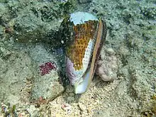 En este ejemplar de Conus leopardus, el roce natural ha erosionado el periostraco de algunas partes de la concha.