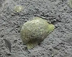 Devonochetes sp., un braquiópodo devónico permineralizado de calcita y, externamente, de pirita. Museo Geominero (Madrid)
