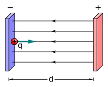 De hecho, la cantidad de carga por metro cuadrado en el numerador de la permitividad del vacío se multiplica por el área de las armaduras, lo que da por tanto la carga total, mientras que el campo eléctrico presente en el denominador se multiplica por la distancia recorrida por la carga que pasa por el condensador, lo que da como resultado el voltaje entre las armaduras. Por lo tanto, se visualiza claramente la relación de capacidad.