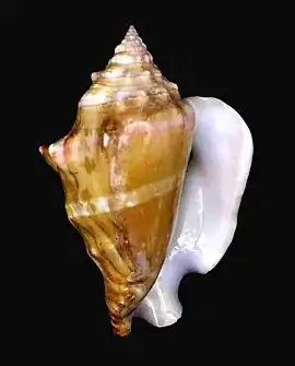 Su concha, gruesa y robusta, puede alcanzar hasta un tamaño de 16,5 cm de largo, con vetas spirales moderadamente bajas en sus primeros giros. Posee nódulos redondeados que van desde la porción más ancha de sus bucles hasta el bucle final de sus teleoconchas, que presenta de una a cuatro filas de nódulos, espaciados entre sí. Tiene un canal sifonal corto y un labio externo expandido, interior entre blanco, amarillo y rosado. La superficie externa varía de blanco a amarillo. Puede estar o no cubierto de manchas marrones irregulares, también rojizas o rosadas. Opérculo córneo, en forma de uña.[2][7]