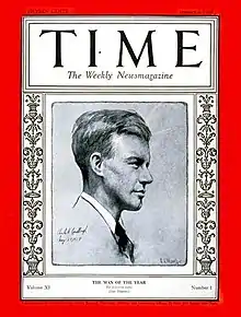 ![]() Portada de la revista Time del 2 de enero de 1928, mostrando a Charles Lindbergh, la primera "persona del año" de 1927 | ||