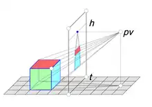- Su proyección vertical respecto al plano del dibujo (el punto verde sobre la línea t-h, obtenido como corte de la visual verde que une el punto de vista con el vértice del cubo en alzado)