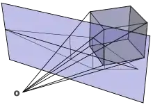 Como se puede observar, el punto de fuga en el que convergen las aristas laterales del cubo aparece espontáneamente, como consecuencia de la posición relativa entre el modelo, el plano del dibujo y el punto de vista. Este procedimiento gráfico es prácticamente el mismo que se utiliza analíticamente para calcular perspectivas por ordenador, determinando la posición de la proyección de los puntos del modelo sobre el plano del dibujo como la intersección de tres planos: el propio plano del dibujo; un plano vertical que pasa por el punto de vista y el punto del modelo; y un tercer plano paralelo a la línea del horizonte que contenga a ambos.[3]