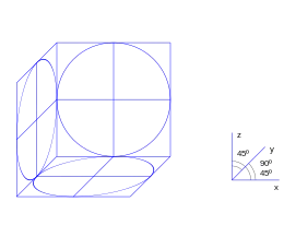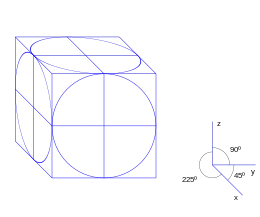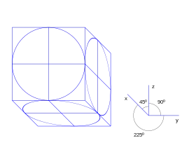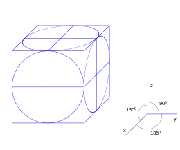 El eje y es horizontal, el eje z es vertical y el eje x forma 45 grados con la horizontal, la medida en los ejes y y z son la medida real, y en el eje x se reduce el 50%. El resultado es el de la figura de la izquierda. El resultado da lugar a que la cara frontal, ejes y, z, es un cuadrado y una circunferencia reales; en las dos caras laterales el cuadrado se transforma en un romboide y la circunferencia en una elipse.