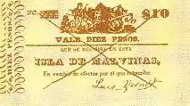 Ya con la colonia argentina desarrollándose prósperamente, uno de los problemas surgidos de la distancia entre el asentamiento de Puerto Soledad a Buenos Aires fue la utilidad del dinero, la forma de pagar los trabajos y dónde se podía gastar ya que no había comercios. Entonces, Vernet hizo imprimir vales expresados en pesos para facilitar las operaciones de provisiones de bienes y pagar a los trabajadores asalariados. Tenían 8 por 12,5 centímetros y, bajo un dibujo con símbolos rurales, se leía: «Vale diez pesos. Que se recibirá en esta Isla de Malvinas, en cambio de efectos por el que suscribe», con la firma de Vernet. Eran notas de pago que fueron el primer circulante en las islas. [3][4]