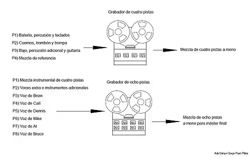 En comparación, Brian Wilson produjo pistas de mayor complejidad técnica haciendo uso del método de reducción de pistas empleando grabadoras de 4 y 8 pistas con tecnología de última generación.[94] La mayoría de las piezas de acompañamiento fueron registradas en una grabadora de 4 pistas, antes de ser mezcladas en mono en una pista de una máquina de 8 pistas. Brian típicamente dividió los instrumentos por tres vías: batería -percusión- teclado, cuernos, y bajo -percusión adicional- guitarras. La cuarta pista por lo general contiene una mezcla de referencia en bruto utilizada durante la reproducción en la sesión, después de ser borrada con doblajes tales como una sección de cuerdas. Después de la mezcla de 4 pistas a mono para grabar la pista a una máquina de 8 pistas, seis de las siete pistas restantes generalmente se usaban para cada una de los voces de los Beach Boys.[94] La última pista se solía reservar para agregar nuevos elementos, como las voces extra o instrumentos adicionales.[68]