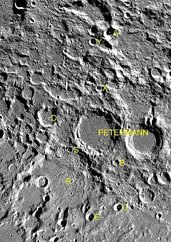 Por convención estos elementos son identificados en los mapas lunares poniendo la letra en el lado del punto medio del cráter que está más cercano a Petermann.