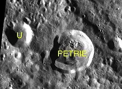 Petrie es un cráter de impacto lunar relativamente pequeño, que se encuentra al este de la llanura del cráter Fabry, de mayor tamaño. Al este se halla el cráter Rayet, más pequeño.