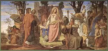 En el centro se representa a la religión; a su derecha, san Bonifacio, el apóstol de Alemania, que predica la religión a un joven que lo escucha atentamente; un viejo bardo y una sacerdotisa se marchan, y acaba de cortarse el roble sagrado por mandato del apóstol. La religión se vuelve hacia un lado, manteniendo en la mano la palma, la promesa de paz. Con la mano derecha apunta a los Evangelios como fuente de verdad. La vida cristiana florece alrededor de ella, y en la parte izquierda se ven representaciones de la poesía cristiana, de la caballería medieval, de la música, y más lejos, en el fondo, las figuras simbólicas de otras artes, el monje muerto para el mundo, pero dedicado al estudio; finalmente, un edificio gótico y una ciudad civilizada —descripción según la Enciclopedia Católica—.