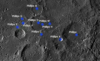 Por convención estos elementos son identificados en los mapas lunares poniendo la letra en el lado del punto medio del cráter que está más cerca de Phillips.