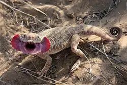 Phrynocephalus mystaceus es una especie de lagarto de la familia Agamidae. Se distribuye por las zonas áridas de Asia Central. Es ovíparo.[1] Alcanza una longitud máxima de 24 centímetros de cabeza-cola. Su característica más llamativa son unos pliegues de color rosado intenso que despliega como mecanismo de defensa frente a los depredadores.