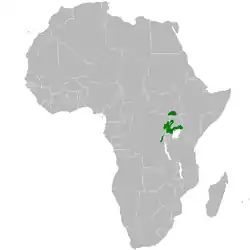 Se encuentra desde el sur de Sudán del Sur y el extremo oriental de la República Democrática del Congo hasta Uganda, el oeste de Kenia y el extremo norte de Tanzania. Su hábitat natural son los bosques húmedos tropicales.