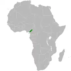 Se encuentra únicamente en las montañas que hay entre el sureste de Nigeria y el oeste de Camerún, además de la isla de Bioko. Su hábitat natural son los bosques húmedos tropicales de montaña.