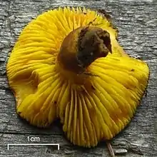 Las branquias son decurrentes o poco decurrentes, y repartidas. Son de color amarillo intenso a amarillo verdoso, a menudo arrugadas, y tienen venas generalmente transversales en los espacios entre las mismas; estas venas transversales a veces dan a las branquias una apariencia similar a la de los poros. El vástago cilíndrico mide de 4 a 7.5 cm (1,6 hasta 3,0 pulgadas) de largo por 7,5 cm (3,0 in) de espesor, y es a menudo ahusado hacia la base. El vástago es firme y sólido (es decir, no hueco), y amarillo, con micelios de color amarillo en la base. Con frecuencia tiene ranuras longitudinales que se extienden hacia abajo de las branquias.[4]