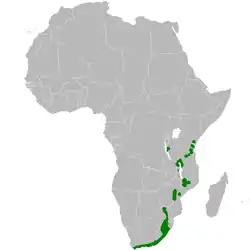Se extiende por el este de África, desde Kenia llegando hasta el cabo de Buena Esperanza, en Sudáfrica. Su hábitat natural son los bosques tropicales y subtropicales secos.