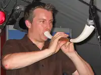 Gafin Morgan tocando un pibgorn de plástico.