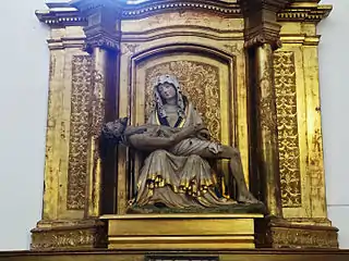 El tema de la Piedad tanto en pintura como en escultura se empezó a difundir en el siglo XIV inspirándose en una devoción que existía desde el siglo XIII; surgió en la Europa central y se difundió ampliamente a través del Camino de Santiago desde los últimos años del siglo XIV. Era la devoción a los dolores y gozos de la Virgen, influencia de la literatura mística oriental que se había ido extendiendo a través de las lecturas piadosas en los conventos femeninos. Los estudiosos del tema lo interpretan argumentando la sensibilidad de la mujer como madre.[4] Provenían las obras de los talleres de Baviera, Bohemia y Austria, lugares donde llegaron a ser especialistas en este tipo de escultura, conocidas también como «piedades horizontales».[nota 1] Casi siempre están elaboradas en piedra y tienen en común la ejecución del plegado de los ropajes que cae en cascada en forma de abanico.[5]