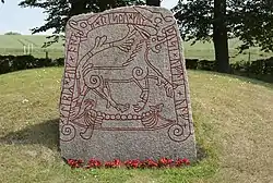 El barco y el lobo en la imagen central probablemente reflejan el mito del Ragnarök, lo que haría que el lobo fuera Fenrir y el barco Naglfar.[3] El barco tiene forma de galera antigua con beques tanto en la proa como en la popa y es diferente a cualquier barco vikingo conocido, lo que sugiere, por su forma arcaica, que es un barco simbólico asociado con un ritual.[1] Otras inscripciones con características similares que pueden representar barcos antiguos y simbólicos incluyen DR 77 en Hjermind, DR 119 en Spentrup, DR 258 en Bösarp y DR 328 en Holmby.[1] El lobo tiene una melena y orejas puntiagudas similares a la representación del lobo en la inscripción DR 284 del Monumento de Hunnestad y los dos lobos en DR 314, la Piedra rúnica de Lund 1.[1]