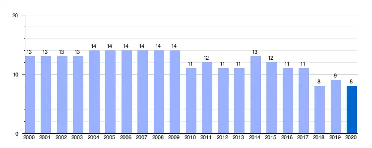 | Gráfica de evolución demográfica de Piedrasluengas entre 2000 y 2020 |