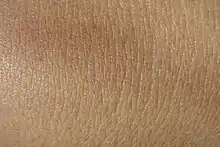 La piel humana es la cubierta exterior del cuerpo y forma parte del sistema tegumentario. La piel humana es el órgano más grande, extenso y pesado del cuerpo (alrededor de 10 % de la masa corporal total de un adulto medio).[1] En adultos, su superficie es de aproximadamente 1,8 m2,[2][3] su grosor varía de 0,5 mm (en los párpados) a 4-5 mm (parte superior de la espalda en particular)[4] . Sin embargo, su superficie de intercambio es mucho más pequeña que la del pulmón (140 m2) o la del intestino (300 m2) y es mucho menos permeable.[5] La especialidad de la medicina que se ocupa de la piel y sus afecciones es la dermatología.