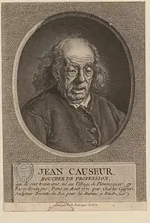Jean Causer, boucher de profession / âgé de cent trente ans, né au Village de Plomoguer, en / Basse-Bretagne. Aguafuerte de Pierre-Charles Levesque (1772) según retrato de Charles-Marie Caffieri.