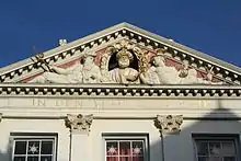También se conservan in situ algunas escultura monumentales, como la decoración en piedra para el frontón y gablete del Gravensteen de Leiden, el frontón de In den vergulden Turk ("la guilda turca", con las figuras de un turco, Neptuno, Mercurio y una cabra de Angora -relacionados con el comercio textil) y 23 figuras de jueces y legisladores para el Vierschaar ("tribunal").[9][6] He also made a series of busts of Roman emperors of which the plasters in Leiden are likely copies.[2]